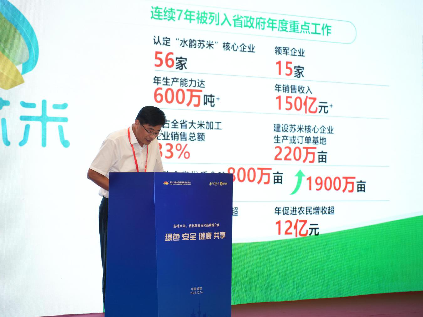 江苏省粮食行业协会常务副会长施启平作“水韵苏米”品牌推介。他指出,江苏地处优质稻作黄金地带,光照足、雨热同季,为水稻生长提供了得天独厚的条件。“水韵苏米”核心品种外观洁白、品质如玉,食味品质呈现“柔、香、糯、甜“的独特风格,深受市场青睐。