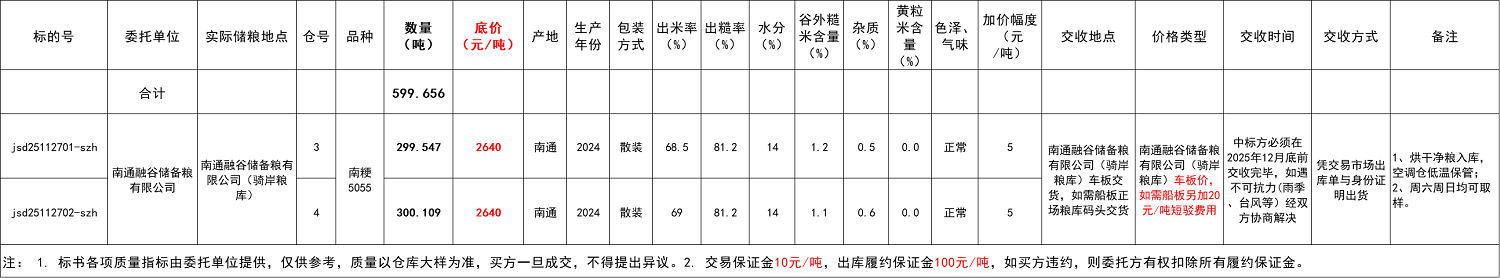 交易价格:南通融谷储备粮有限公司(骑岸粮库)车板价,如需船板正场粮库码头交货并另加20元/吨短驳费用,销售底价2640元/吨。竞价阶梯5元/吨,应价起点数量为每个标的的全部数量,收取中标方成交金额1.5‰的手续费。