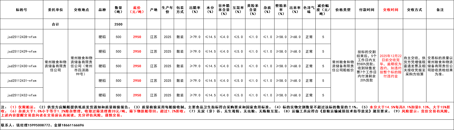 4.交收事项:详见交易清单。(1)仅限船运。(2)供货方应随船提供纸质发货通知和质量检验报告。(3)质量检验采用每船验收制,主要食品卫生指标符合采购要求和国家食用标准。(4)标的实物交割数量不超过该标的数量的±1%。(5)水分大于14.5%每高0.1%扣量0.13%,大于15%拒收。(6)杂质大于1.0%小于等于1.2%除杂整理,收取过筛清理费20元/吨,筛下物原船带回。超过1.2%拒收。(7)无泥(芽)谷、无生霉粒、无虫粮、无陈粮互混。(8)运输工具应符合《原粮运输减损技术指导意见》规范要求。(9)风险提示:竞价交易有风险,上述内容提醒交易意向者在交易前认真阅读,充分评估风险,谨慎交易。(10)交易标的质量以常州粮食和物资储备有限责任公司验收质检结果为准。