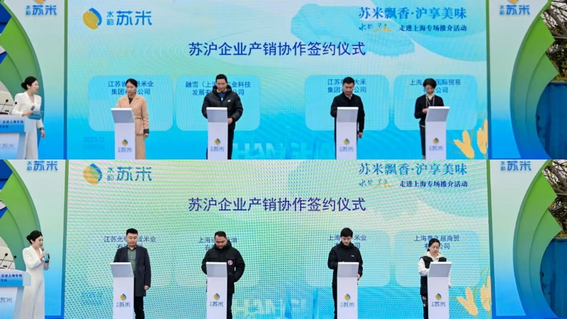 为了让上海市民“吃得放心、买得安心”,推介会现场还举行了“水韵·苏米”品牌质量承诺仪式,确保每一粒抵达上海市场的苏米都安全、优质、可追溯。承诺引领行动,合作结出硕果。江苏省农垦米业集团有限公司、融雪(上海)农业科技发展有限责任公司等8家苏沪企业完成产销对接签约,实现江苏“米袋子”与上海“菜篮子”的紧密相连,实质性地推动了两地粮食产业的互融互通。