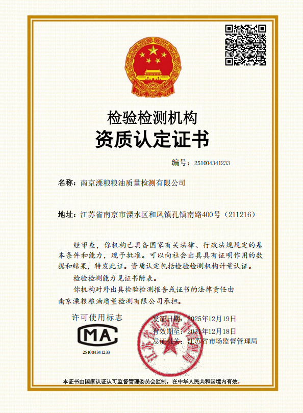 2025年12月19日,经江苏省市场监督管理局严格评审,南京溧水粮食购销有限公司下属全资子公司南京溧粮粮油质量检测有限公司成功通过检验检测机构资质认定(CMA),正式获得“检验检测机构资质认定证书”(证书编号:251004341233)。