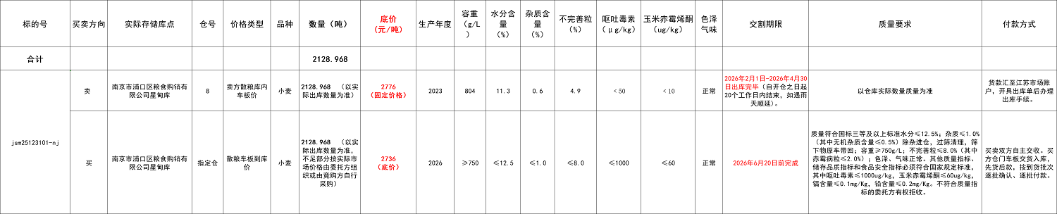 1.1品种及数量:2023年产小麦2128.968吨,具体数量以实际出库数量为准,详见交易清单。