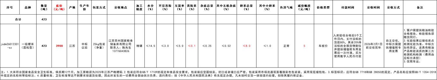 交易方式:本次竞价交易通过国家粮食交易中心竞价交易平台进行。会员点击“交易”,再点击“地方政策性粮-江苏市场”进入“苏州分市场地方粮食交易专场”参与交易。
