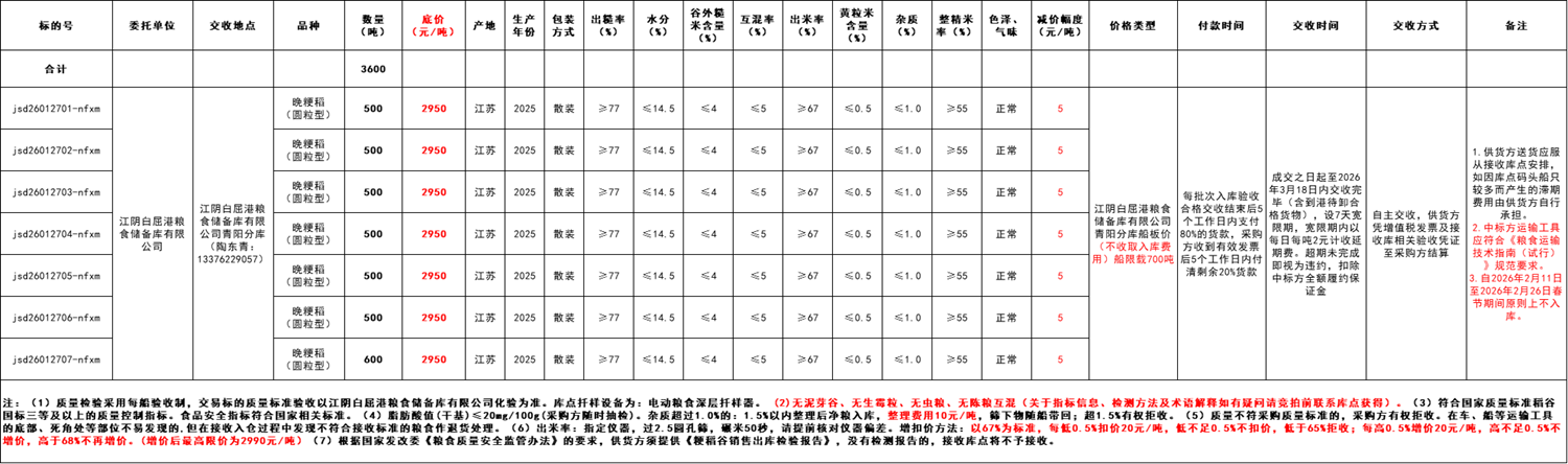 4.交收事项:详见交易清单。(1)质量检验采用每船验收制,交易标的质量标准验收以江阴白屈港粮食储备库有限公司化验为准。库点扦样设备为:电动粮食深层扦样器。 (2)无泥芽谷、无生霉粒、无虫粮、无陈粮互混。(3)符合国家质量标准稻谷国标三等及以上的质量控制指标。食品安全指标符合国家相关标准。(4)脂肪酸值(干基)≤20mg/100g(采购方随时抽检)。杂质超过1.0%的:1.5%以内整理后净粮入库,整理费用10元/吨,筛下物随船带回;超1.5%有权拒收。(5)质量不符采购质量标准的,采购方有权拒收。在车、船等运输工具的底部、死角处等部位不易发现的,但在接收入仓过程中发现不符合接收标准的粮食作退货处理。(6)出米率:指定仪器,过2.5圆孔筛,碾米50秒,请提前核对仪器偏差。增扣价方法:以67%为标准,每低0.5%扣价20元/吨,低不足0.5%不扣价,低于65%拒收;每高0.5%增价20元/吨,高不足0.5%不增价,高于68%不再增价。(增价后最高限价为2990元/吨)(7)根据国家发改委《粮食质量安全监管办法》的要求,供货方须提供《粳稻谷销售出库检验报告》,没有检测报告的,接收库点将不予接收。(8)供货方送货应服从接收库点安排,如因库点码头船只较多而产生的滞期费用由供货方自行承担。中标方运输工具应符合《粮食运输技术指南(试行)》规范要求。自2026年2月11日至2026年2月26日春节期间原则上不入库。