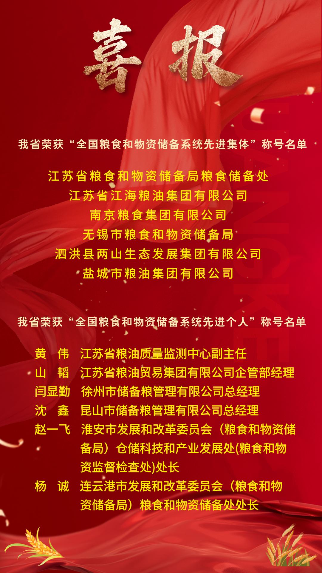 近日,人力资源社会保障部与国家粮食和物资储备局联合印发《关于表彰全国粮食和物资储备系统先进集体和先进个人的决定》(人社部发〔2025〕72号),并于2025年12月31日,在北京召开了全国粮食和物资储备系统先进集体和先进个人表彰会议。其中,我省粮食和物资储备局粮食储备处等6个集体被授予“全国粮食和物资储备系统先进集体”称号,黄伟等6名个人被授予“全国粮食和物资储备系统先进个人”称号。