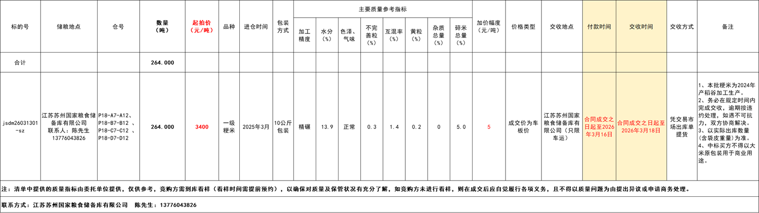 此次竞价销售的标的物为一级粳米(2025年3月加工)264吨。