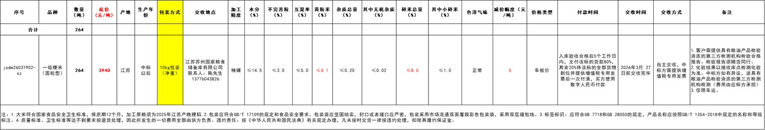 交易方式:本次竞价交易通过国家粮食交易中心竞价交易平台进行。会员点击“交易”,再点击“地方政策性粮-江苏市场”进入“苏州分市场地方粮食交易专场”参与交易。