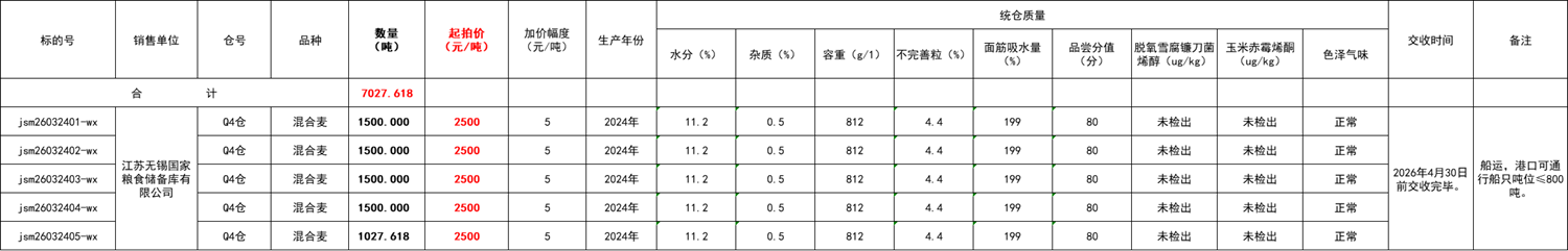 标的物详情见2026年3月24日无锡市级地方储备小麦网上竞价销售清单。
