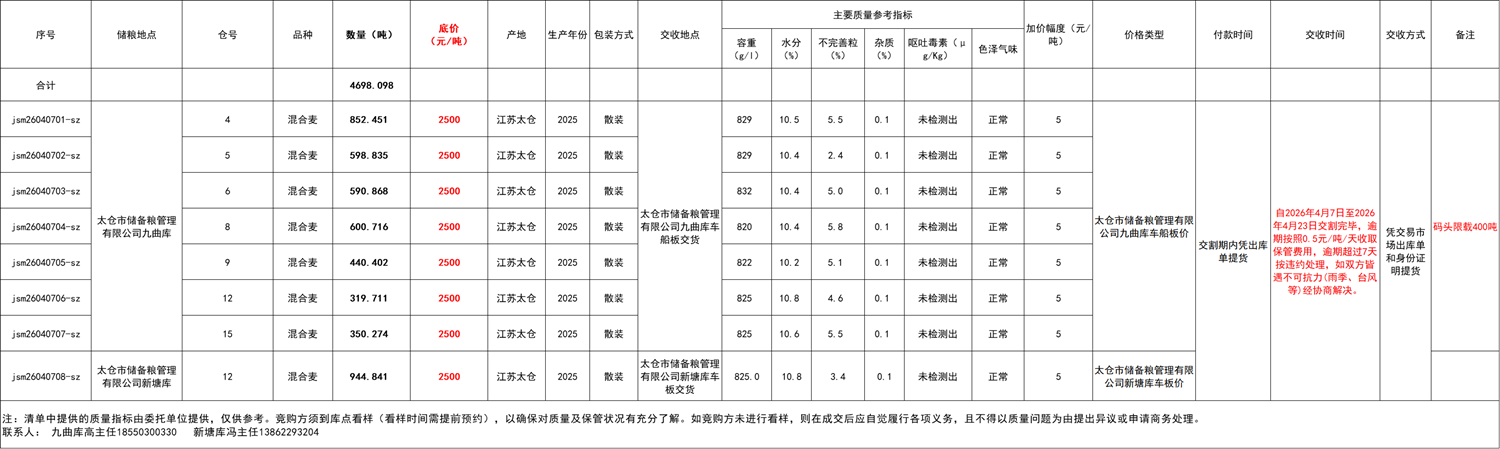 标的物详情见2026年4月7日江苏(苏州太仓)储备小麦网上竞价销售清单。