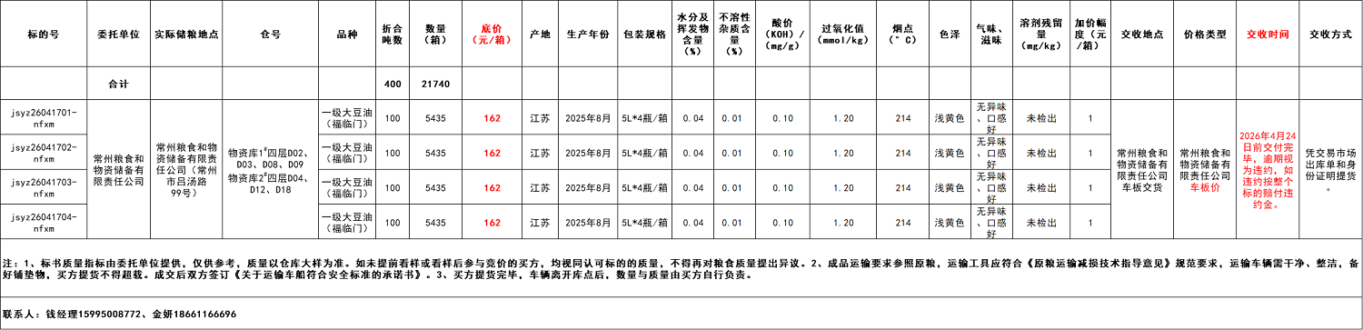 交易价格:常州粮食和物资储备有限责任公司车板价。应价起点数量为每个标的的全部数量。销售底价:2025年8月生产一级大豆油(福临门)162元/箱,竞价阶梯1元/箱,收取中标方成交金额2‰的手续费。