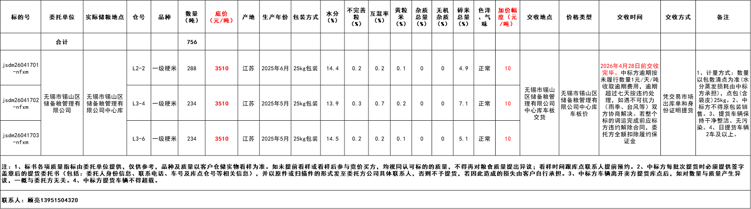 交易价格:无锡市锡山区储备粮管理有限公司中心库车板价。应价起点数量为每个标的的全部数量。销售底价:2025年6月/2025年5月产一级粳米3510元/吨,竞价阶梯10元/吨,收取中标方成交金额2‰的手续费。
