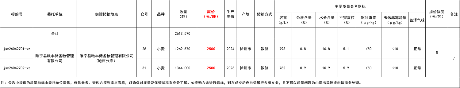 数量:2613.570吨,分两个标段,其中,2023年产小麦1344吨,2024年产小麦1269.570吨。(详见交易清单)
