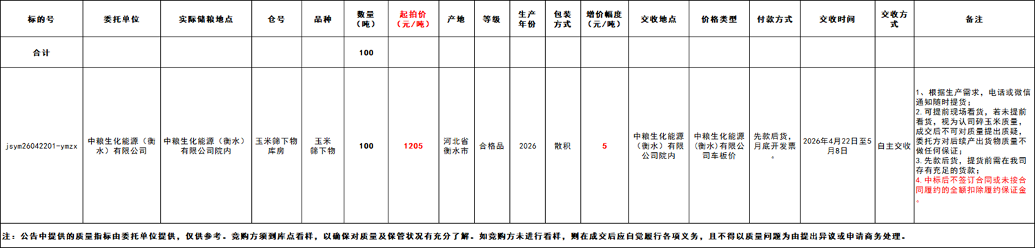 交易价格:中粮生化能源(衡水)有限公司院内车板价。应价起点数量为每个标的的全部数量。销售底价:1205元/吨,竞价阶梯5元/吨,按成交数量1元/吨向中标方收取手续费。(成交后手续费直接从交易保证金中扣除,无需另外缴纳)。