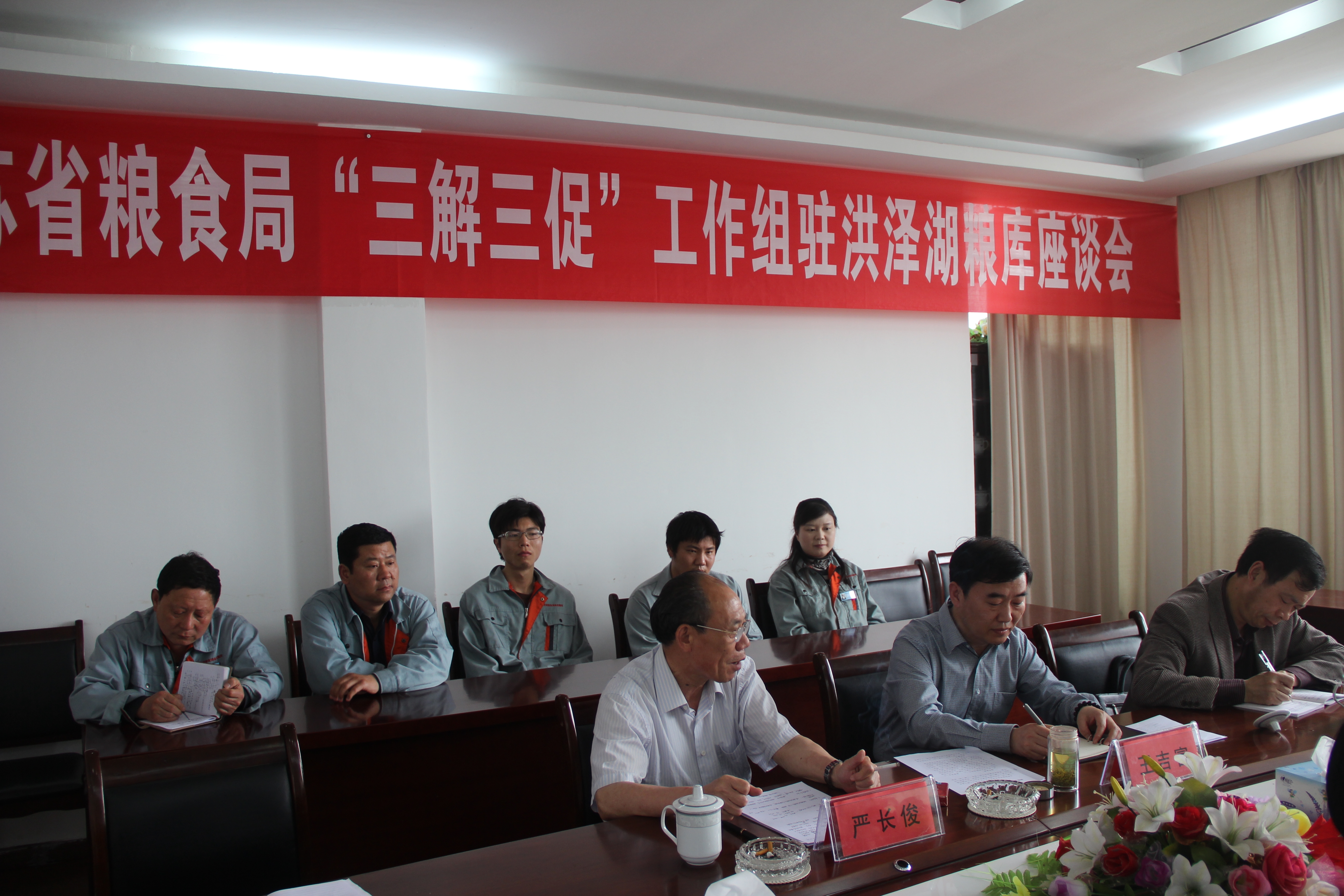 严长俊主持召开了洪泽湖粮库领导班子成员和职工座谈会,在听取粮库主任关于企业发展情况的汇报后,充分肯定了洪泽湖粮库的各项工作,认为洪泽湖粮库建设是规范的、管理是到位的、合作是成功的、班子是团结的。严长俊重点就当前的粮食形势以及目前从事粮食工作面临的压力做了深入浅出的分析,并与职工进行了广泛的沟通交流,提出了做好今年夏粮收购的对策和措施,要求粮库全体职工要抓住机遇、做好工作、谋求效益、谋求发展。省局将尽最大努力,帮助企业提高补贴标准、提高烘干能力、提高检测能力,并对企业数字粮库建设、太阳能发电等项目给予适当支持。同时,严长俊还特别强调要高度重视储粮安全、生产安全、个人安全。严长俊一行积极参加粮库的劳动,走进仓房核查库存实物,仔细了解粮堆温度和水分情况,要求洪泽湖粮库采取科学有效措施,加强春季保粮,确保粮食安全度夏。