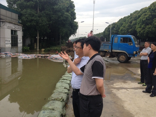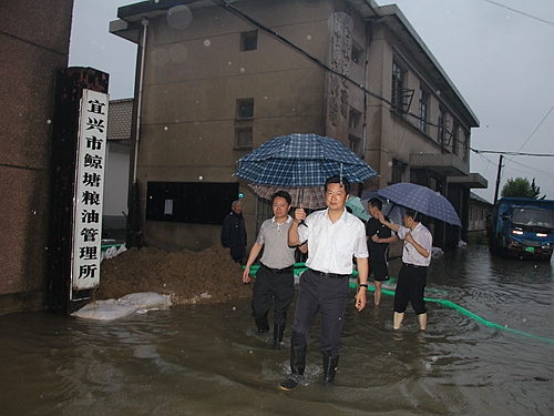 3、迅速抢险。面对汛情,全市各级粮食部门和各基层粮库迅速行动起来,全力以赴开展防汛抗灾工作。局领导分别挂钩一个片区和一个粮库,赶赴现场,指导救灾。尤其是,张海泉局长、黄燕萍副局长、马骏副局长第一时间赶赴受灾最严重的宜兴地区,调研灾情,靠前指挥,连续奋战在抗洪一线指导抗洪救灾工作。7月2日下午,张局长陪同省粮食局陈杰局长视察了宜兴鲸塘、元上粮库,并在陈局长的带领下,精心部署宜兴的防汛工作。受灾较严重的宜兴地区本着严防死守的理念,上下一心,全员动员,全员参与,全员抗洪,同时,科学调度,科学指挥,连夜向当地政府汇报了受灾情况,并请求市政府协调当地武警官兵360人紧急支援,协助抗洪抢险,使灾情得到了控制。江苏无锡国家粮食储备库由于库存紧张,在宜兴地区的杨巷华东香米业和潘家坝兴恒米业代储1.9万吨原粮。由于地势低洼,两个代储点全部进水,面临灾情,国储库党政主要领导及全体员工团结一致,众志成城,组织青年突击队,全员上阵,全力奋战,由于措施得力,抢险及时,目前,已安全转移粮食1.45万吨,极大的降低了粮食受损率。
