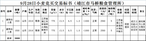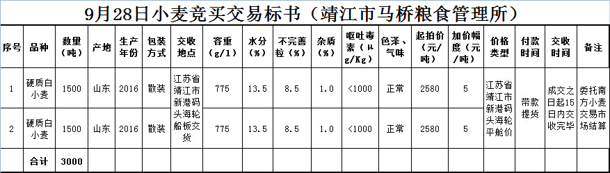 按照《南方小麦交易市场现货竞价交易规则(暂行)》的有关规定,受靖江市马桥粮食管理所委托,本市场定于2016年9月28日开展小麦现货竞价交易,拟销售3000吨小麦。现将有关事宜公告如下: