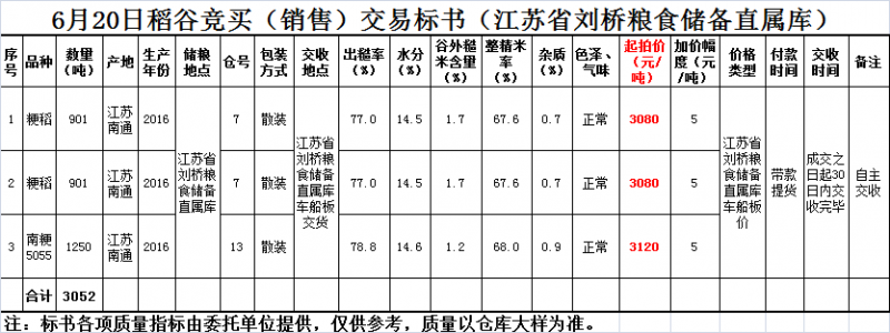 按照《南方小麦交易市场现货竞价交易规则(暂行)》的有关规定,受江苏省刘桥粮食储备直属库委托,本市场定于2017年6月20日开展稻谷现货竞价交易,拟销售3052吨稻谷。现将有关事宜公告如下: