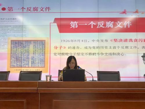 沈珺同志从重温中国共产党在不同时期正风反腐的工作历程入手,从认清全面从严治党的新形势、掌握反腐标本兼治的新举措、落实中央八项规定的新精神、展示党员廉洁担当的新形象等四个方面论述了狠抓党风廉政建设和反腐败斗争的重大意义,详细介绍了正风反腐的“六个第一”、作风建设的战略成果,拓展延伸到党员干部如何做表率、勇担当、讲廉政。同时,还结合粮食和物资储备行业、系统内的腐败案例,重点解读了我们党不断保持党的先进性和纯洁性,不断防范被瓦解、被腐化的危险的历史。这堂“纪律课”紧密联系纪委职能职责,具有很强的针对性和实用性。