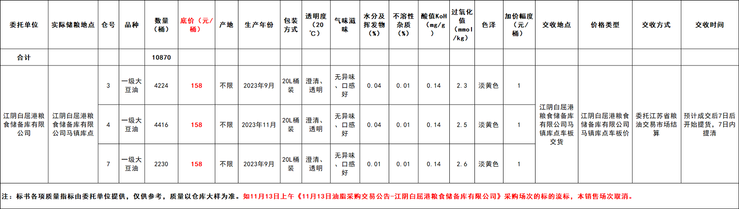 注意:如2024年11月13日上午《11月13日油脂采购交易公告-江阴白屈港粮食储备库有限公司》采购场次的标的流标,本销售场次取消。