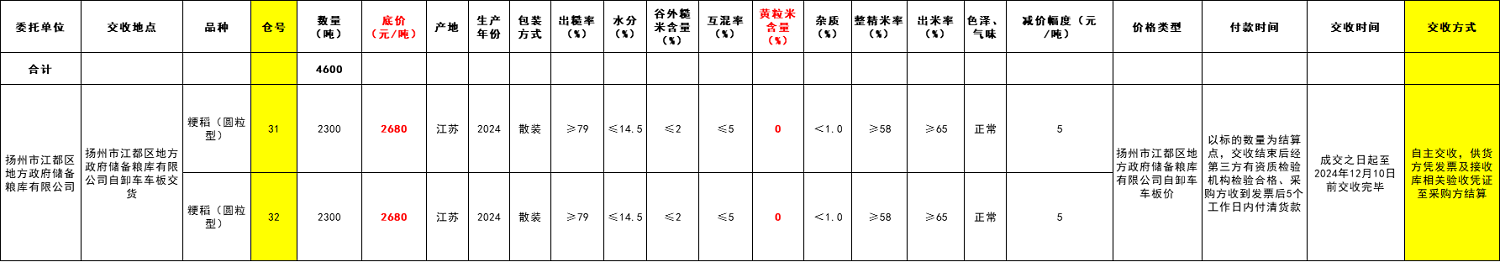 4.交收事项:详见交易清单。1、根据国家发改委《粮食质量安全监管办法》的要求,中标方需随货提供粮食质量检验报告。2、质量标准初检以扬州市江都区地方政府储备粮库有限公司化验为准(所有质量标准以电动吸式扦样器取样检验为准)。3、质量标准、卫生标准等达不到要求按退货处理,由此所发生的一切费用全部由供方负责。4、其他违约责任按《中华人民共和国民法典》有关规定处理。5、以采购质量为基准。不符合采购质量拒收,发现陈粮混入、虫粮、泥芽谷、霉变粒拒收,食品安全指标不符合国家相关标准拒收。以出米率65%为基数,出米高于65%不增价,出米率低于65%拒收。