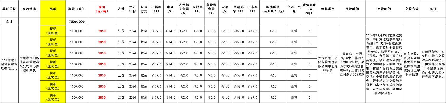 4.交收事项:详见交易清单。(1)交易标的质量标准验收以无锡市锡山区储备粮管理有限公司化验为准;(2)出米率指定仪器,规定做法,请提前校对仪器偏差;(3)食品安全、卫生指标符合国家相关标准;(4)无泥芽谷、无生霉粒、无虫粮、无陈粮互混;(5)水分大于14.5%拒收;谷外糙米含量大于2.0%拒收;杂质超过1.0%拒收;(6)出米率为66.5%-66.9%,在成交价基础上扣除20元/吨;出米率为66%-66.4%,在成交价基础上扣除40元/吨;出米率低于66%拒收。(7)仅限船运;(8)允许中标方交收时存在1%溢短;(9)供货船只保持干净整洁无污染;(10)进入库区遵守库区规定。