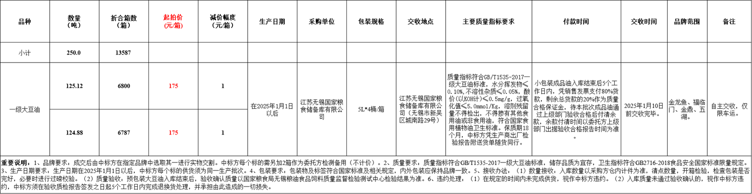 采购品种及数量:一级大豆油250吨(折算成包装数量13587箱),共分2个标段。