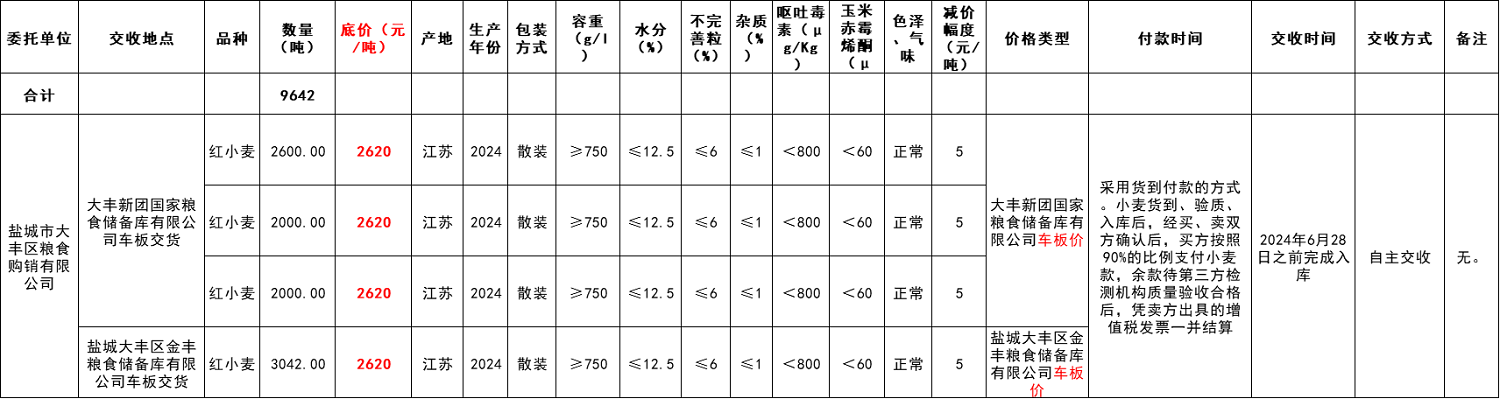 5.交易价格:大丰新团国家粮食储备库有限公司车板价/盐城大丰区金丰粮食储备库有限公司车板价。应价起点数量为每个标的的全部数量。起拍价2620元/吨,竞拍减价幅度5元/吨,收取中标方成交金额2‰的手续费。