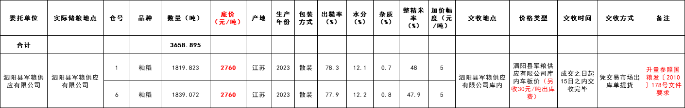 交易价格:泗阳县军粮供应有限公司库内车板价(另收30元/吨出库费)。应价起点数量为每个标的的全部数量。销售底价:2023年产籼稻2760元/吨,竞价阶梯5元/吨,收取中标方成交金额1.5‰的手续费。