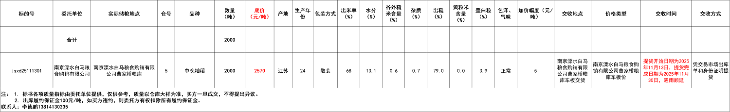 中标方成交后将货款汇至江苏市场账户(与保证金账户一致)并申请出库单,凭市场出库单和身份证明到卖方指定库点提货,交割完成后买卖双方凭双方确认单到交易市场退保证金(保证金不冲抵货款,待合同履约结束后统一释放)。交割期为2025年11月13日至2025年11月30日止,交款期为2025年11月13日至2025年11月30日止,带款提货。