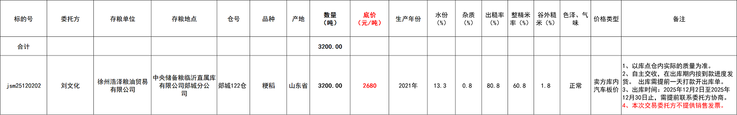 (交易取消)12月2日江苏(山东临沂)地方粳稻竞价销售交易公告-刘文化(个人)