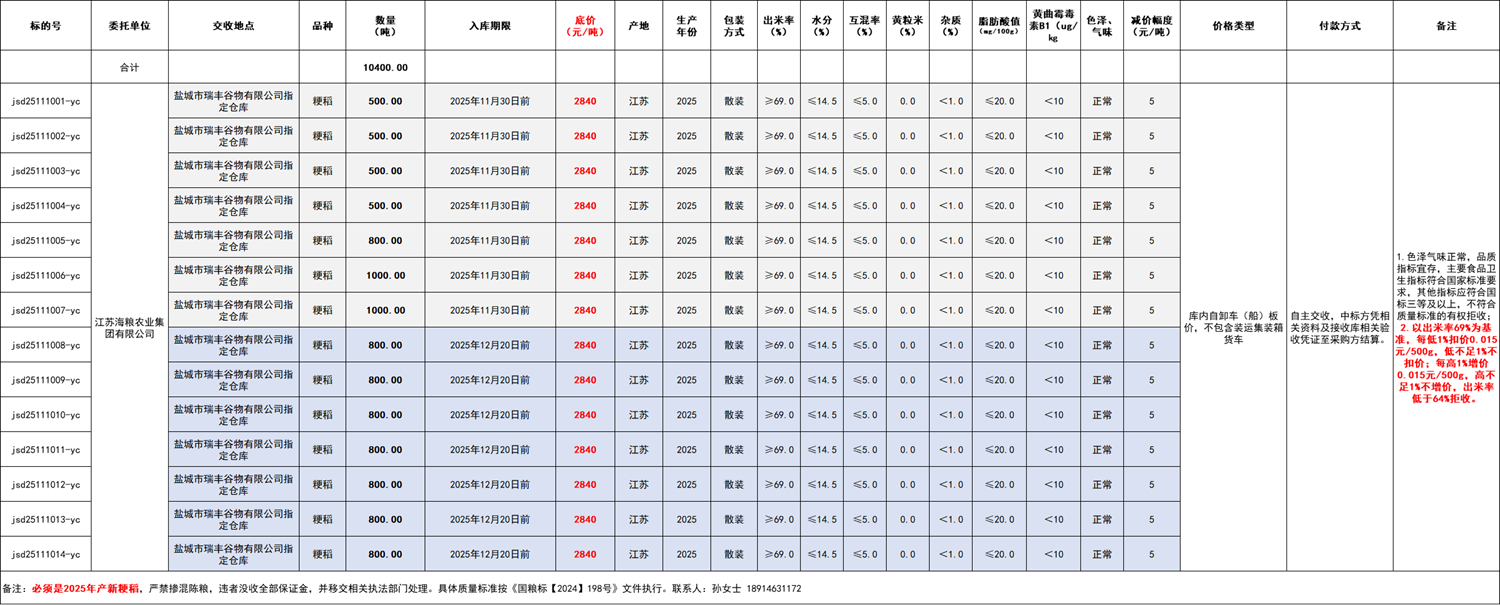 4.入库价格:本次委托采购的标的底价2800元/吨 2840元/吨(因市场行情波动,此项于11月7日更新,详见补充公告)(详见交易清单),竞拍增减价幅度5元/吨。