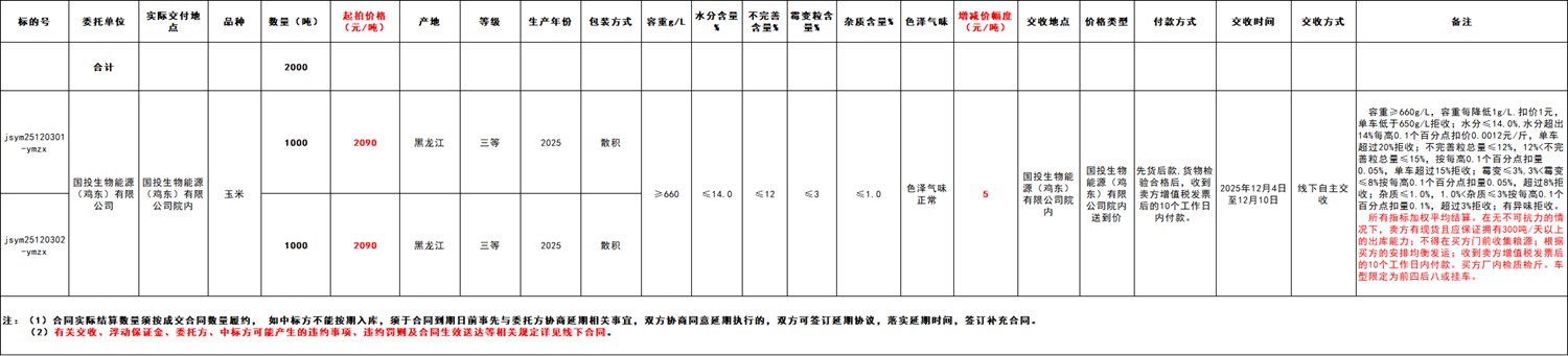 2.本次竞价采购交易起拍价:2090元/吨,竞价幅度为人民币5元/吨。交易价格类型为国投生物能源(鸡东)有限公司院内送到价。