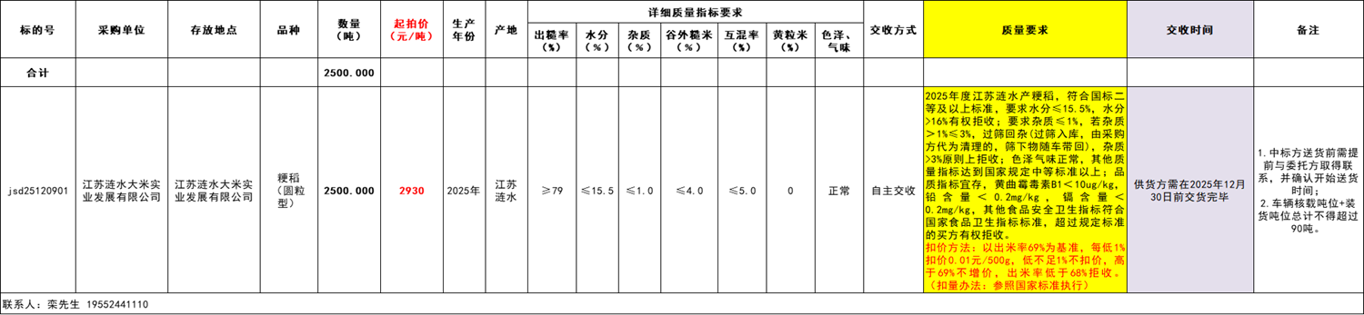 2.品质要求:2025年涟水产粳稻,符合国标二等及以上标准。出糙率≥79%;杂质≤1%;水分≤15.5 %;出米率≥69%(上海青浦绿洲精米机型号LTJM-160、50秒,Φ2.5mm圆孔筛);整精米率≥58%;互混率≤5%;谷外糙米含量≤4.0%;黄粒米不允许检出。色泽、气味:正常;无泥芽谷、无生霉粒、无虫粮、无陈粮互混;过筛净粮入库,筛下物供货方带回。食品卫生指标符合国家相关标准(黄曲霉毒素B1;铅≤0.2 mg/kg;镉≤0.2 mg/kg)。水分以15.5%为基础,每高0.5个百分点扣量0.65%,高不足0.5个百分点,不计扣量,水分>16%拒收。杂质>3%拒收,谷外糙米含量>4%拒收。扣价方法修改为:以出米率69%为基准,每低1%扣价0.01元/500g,低不足1%不扣价,高于69%不增价,出米率低于68%拒收。(因委托方调整计划,品质要求更新,详见补充公告)基本无虫粮,品尝评分值(分)≥70,脂肪酸值≤20mg/100g。所有质量指标均以电动吸式扦样器取样检验为准。中标单位发运的粳稻谷必须进行整理,确保作业时无明显根茎、稻芒积聚,无明显扬尘,符合整洁干净的要求。