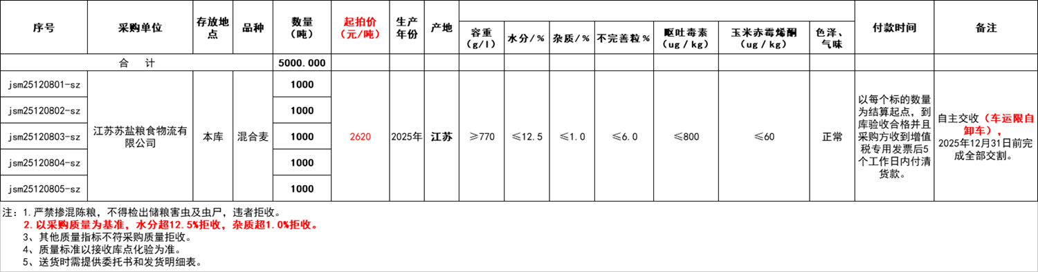 受苏州市储备粮管理有限公司委托,江苏苏盐粮食物流有限公司作为采购方,江苏粮油商品交易市场举办工业园区地方政府储备小麦竞价采购交易活动。具体事宜公告如下: