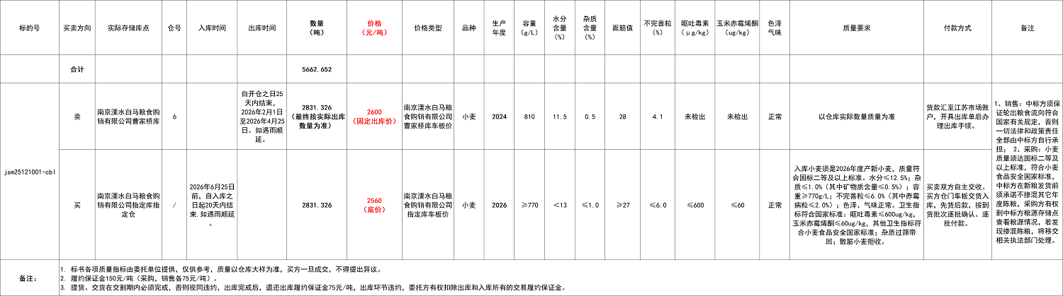 12月10日江苏(南京溧水)地方小麦购销双向(以销竞采)交易公告-南京溧水白马粮食购销有限公司