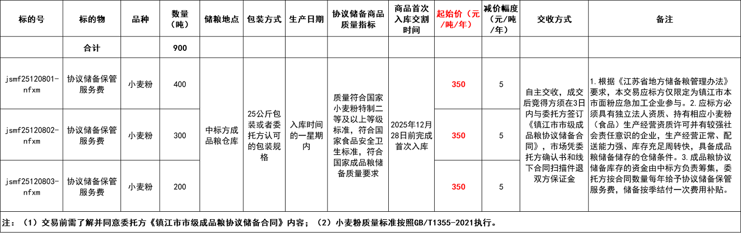 1.1竞价标的:镇江市市级储备成品粮(面粉)协议储备保管服务费。根据《江苏省地方储备粮管理办法》要求,本交易应标方仅限定为镇江市本市面粉应急加工企业参与。