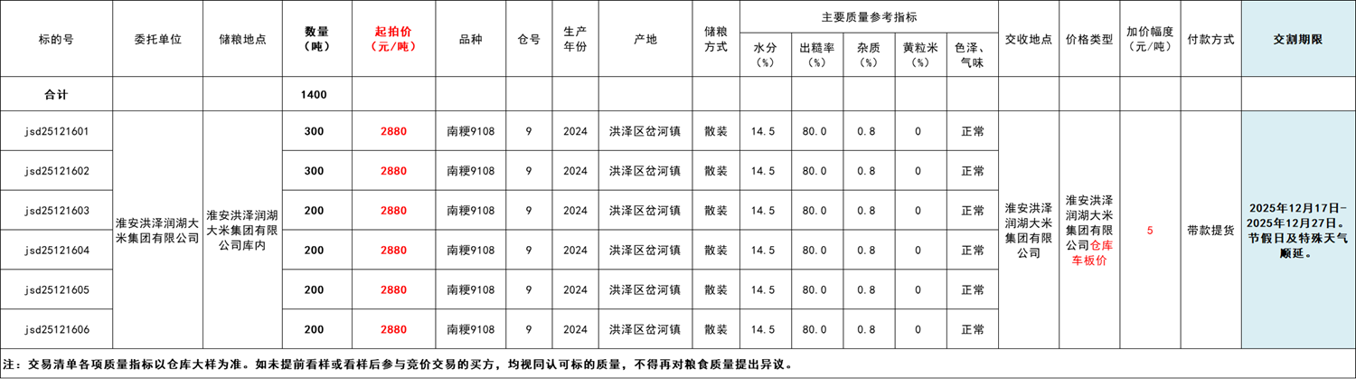 交收地点:淮安洪泽润湖大米集团有限公司库内,详见交易清单。