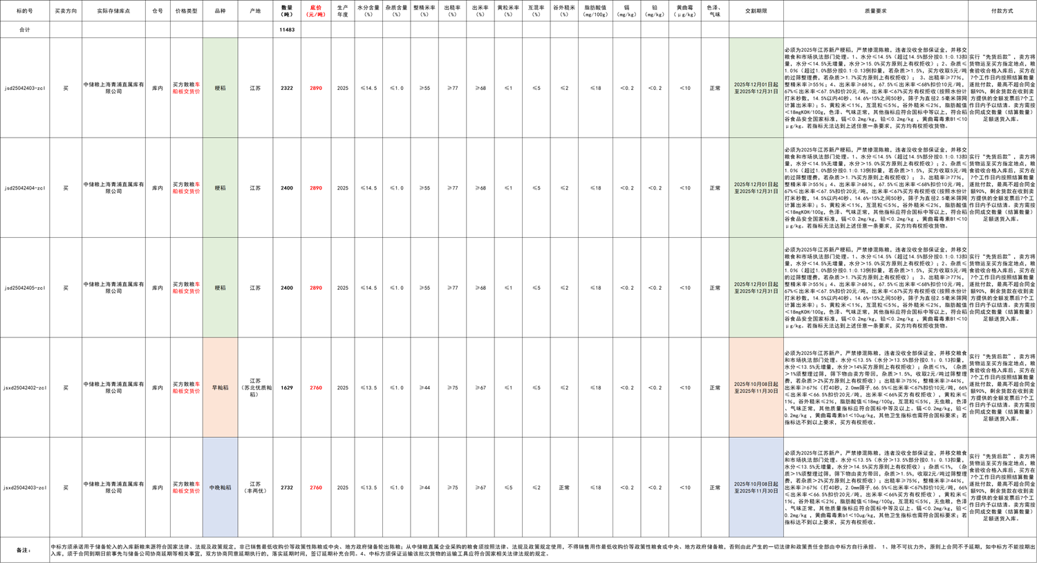 中晚籼稻:必须为2025年江苏新产,严禁掺混陈粮,违者没收全部保证金,并移交粮食和市场执法部门处理。水分≤13.5%(水分>13.5%部分按0.1:0.13扣量,水分<13.5%无增量,水分>14.5%买方原则上有权拒收);杂质≤1%,(杂质>1%须整理过筛,筛下物由卖方带回,杂质>1.5%,收取2元/吨过筛整理费,若杂质>2%买方原则上有权拒收);出糙率≥75%,整精米率≥44%,出米率≥67%(打40秒,2.0mm筛子,66.5%≤出米率<67%扣价10元/吨,66%≤出米率<66.5%扣价20元/吨,出米率<66%买方有权拒收),黄粒米≤1%,谷外糙米≤2%,脂肪酸值≤18mg/100g,互混粒≤5%,无虫粮,色泽、气味正常,其他质量指标应符合国标中等及以上。镉<0.2mg/kg,铅<0.2mg/kg,黄曲霉毒素b1<10ug/kg。