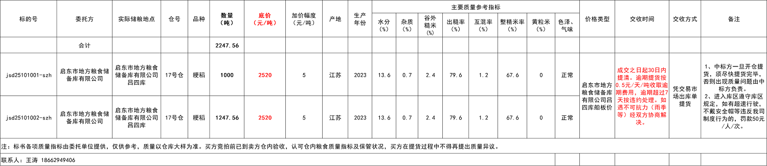 交易价格:启东市地方粮食储备库有限公司吕四库船板价,销售底价2520元/吨。竞价阶梯5元/吨,应价起点数量为每个标的的全部数量,收取中标方成交金额1.5‰的手续费。