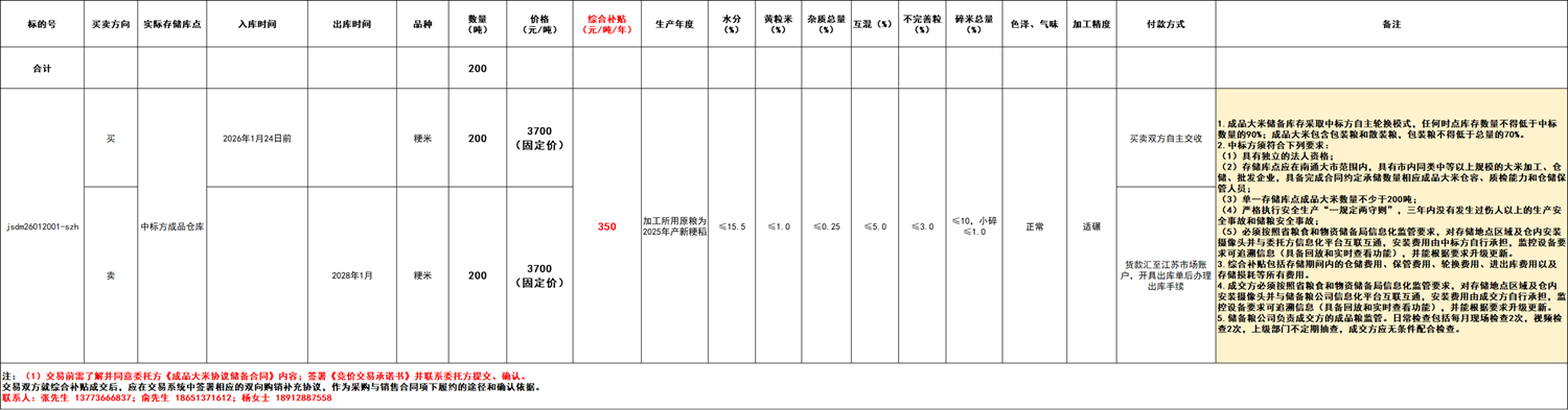 交易方式:交易全部采取网上远程交易模式。本次竞价交易通过国家粮食交易中心竞价交易平台进行。登录国家粮食交易中心网页,会员点击“交易”,再点击“地方政策性粮-江苏市场”进入“苏中分中心地方粮食采购专场”参与交易