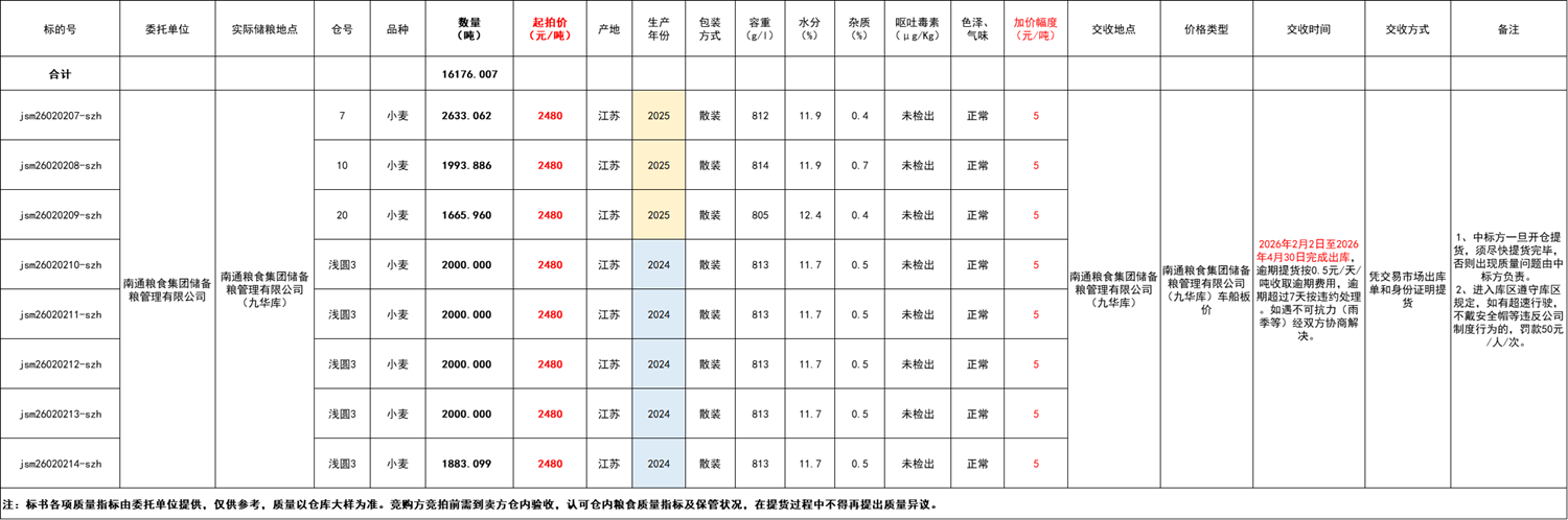 交易价格:南通粮食集团储备粮管理有限公司(九华库)车船板价,销售底价2480元/吨。竞价阶梯5元/吨,应价起点数量为每个标的的全部数量,收取中标方成交金额1.5‰的手续费。