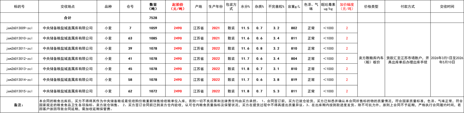 交易方式:本次交易全部采取网上远程交易模式,交易通过国家粮食交易中心-新版地方竞价交易平台进行。会员点击“交易”,再点击“地方政策性粮-江苏市场”进入“中储粮江苏分公司销售专场”参与交易。