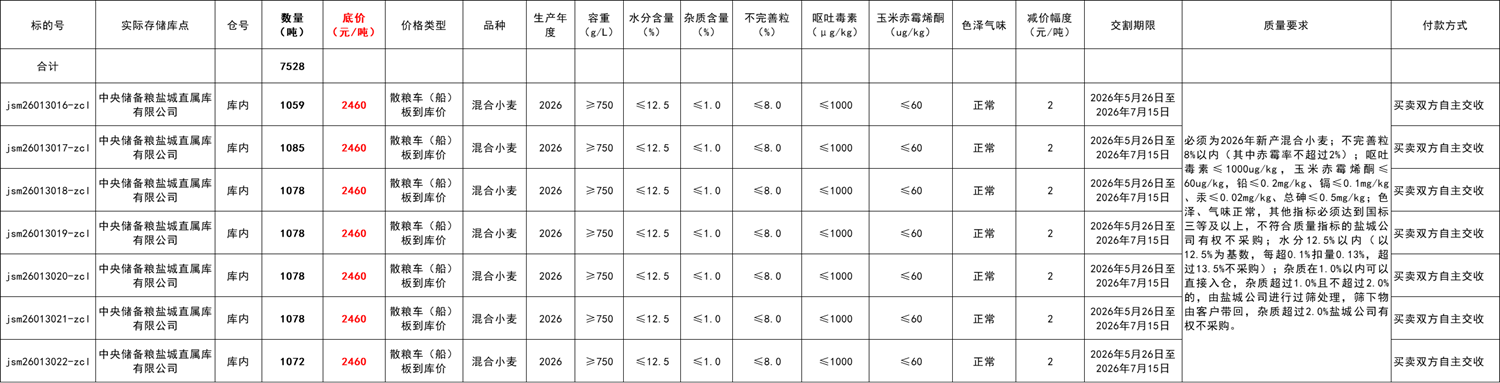3.质量要求:中标方轮入粮食来源必须符合国家相关规定,否则一切法律和政策责任全部由中标方承担。必须为2026年新产混合小麦;不完善粒8%以内(其中赤霉率不超过2%);呕吐毒素≤1000ug/kg,玉米赤霉烯酮≤60ug/kg,铅≤0.2mg/kg、镉≤0.1mg/kg、汞≤0.02mg/kg、总砷≤0.5mg/kg;色泽、气味正常,其他指标必须达到国标三等及以上,不符合质量指标的盐城公司有权不采购;水分12.5%以内(以12.5%为基数,每超0.1%扣量0.13%,超过13.5%不采购);杂质在1.0%以内可以直接入仓,杂质超过1.0%且不超过2.0%的,由盐城公司进行过筛处理,筛下物由客户带回,杂质超过2.0%盐城公司有权不采购。所有指标以实际收购库点电动扦样机扦得的样品经库点化验室检测后的质量为准。严禁掺杂陈粮、以陈顶新,一经查实,买方有权终止合同,按卖方违约处理,由此所产生的政策风险及相关责任均由卖方承担。