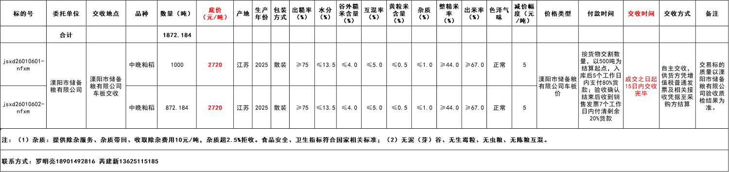 1月6日中晚籼稻采购交易公告-溧阳市储备粮有限公司