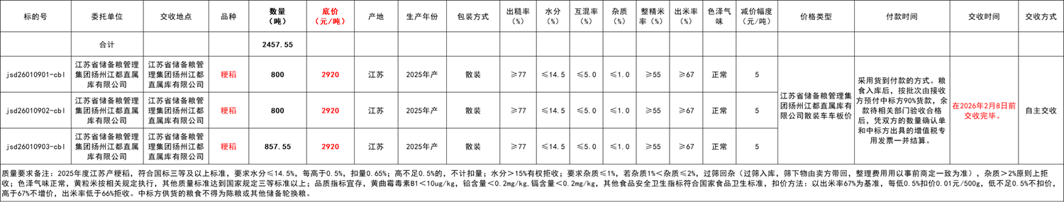 交易方式:本次竞价交易使用国家粮食交易平台新版地储交易系统,通过网络对委托标的依次按交易节进行交易。请会员通过国家粮食交易中心官网,登录“国家粮食交易平台”→“交易”→“江苏”→“江苏省储备粮管理集团有限公司采购交易专场”参与交易。