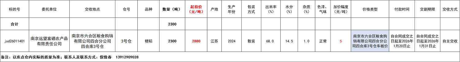 质量:公告中提供的质量指标由委托单位提供,仅供参考。竞购方须到库点看样(看样时间需提前预约,联系人:倪俭春 13912909028),以确保对质量及保管状况有充分了解。如竞购方未进行看样,则在成交后应自觉履行各项义务,且不得以质量问题为由提出异议或申请商务处理。