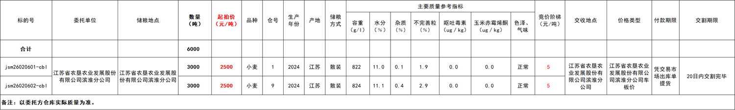 交收地点:江苏省农垦农业发展股份有限公司滨淮分公司,详见交易清单。