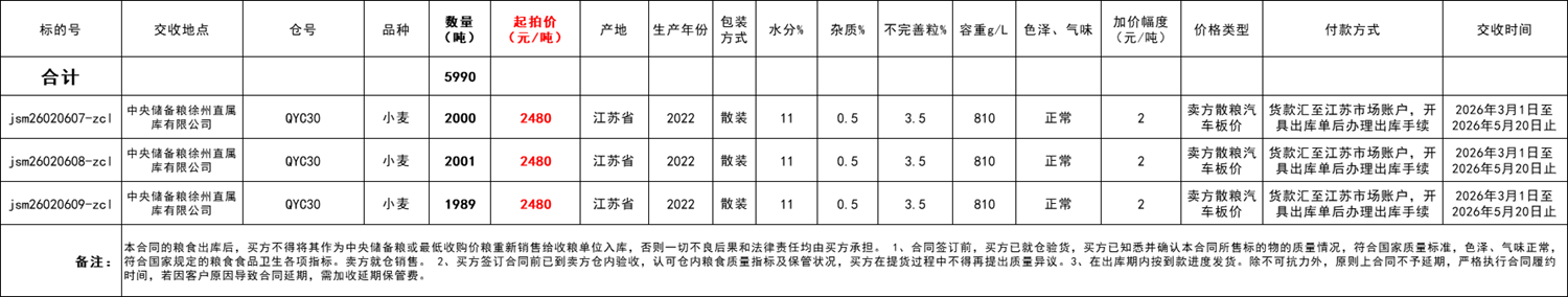 交易价格:卖方库内汽车板价。应价起点销售底价2480元/吨,竞价阶梯2元/吨。中标方须保证轮出小麦流向符合国家有关规定,并不得用作中央和各级地方储备小麦的轮入,否则一切法律和政策责任全部由中标方自行承担。
