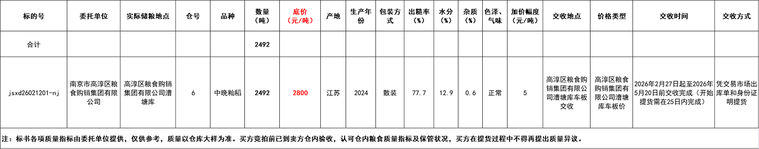 交款、交割期为2026年2月27日起至2026年5月20日前交收完成(开始提货需在25日内完成)。中标方成交后凭市场出库单和身份证明到卖方指定库点提货,交割完成后买卖双方凭双方确认单到交易市场退保证金(保证金不冲抵货款,待合同履约结束后统一释放)。该批稻谷为地方储备粮,粮食行政主管部门批准同意轮出后出库。