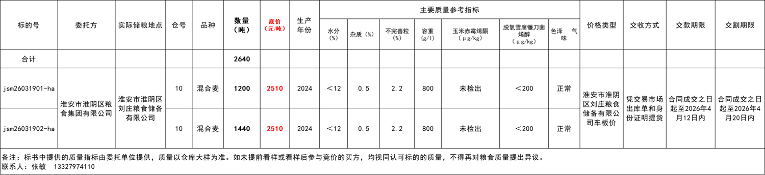 交易价格:淮安市淮阴区刘庄粮食储备有限公司车板价。应价起点数量为每个标的的全部数量。销售底价2510元/吨,竞价阶梯5元/吨,收取买方成交金额1.5‰的手续费(成交后手续费从交易保证金中扣除,无需另外缴纳)。